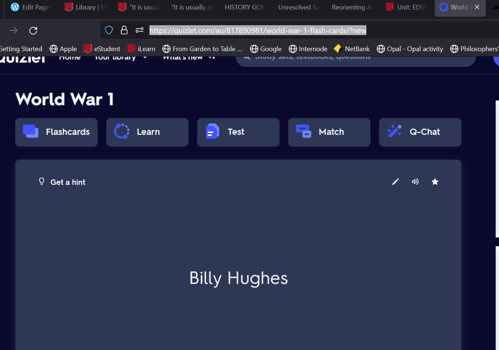‘Spaced repetition is a smart way to help you remember things for a long time.’ (quizlet). Quizlet is a lower order thinking application. Bower (2017) would classify it as a tool for the ability of ‘remember’. Here is a WW1 quizlet (https://quizlet.com/au/817890981/world-war-1-flash-cards/?new) I created this post. It has 26 events from the First World War, these are initially shown as flash cards. Quizlet allows the user to test the knowledge they are learning by additionally engaging a multiple choice of the data.